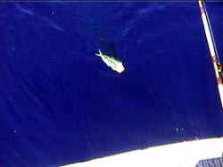 La cena è assicurata, stiamo discutendo della ricetta (al forno con pomodorini pachino, patate, una scorzetta di limone e un filo di olio extravergine di oliva) quando, esattamente 20 minuti dopo, il mulinello parte di nuovo. "Sarà un sacchetto" - dice Max, ma non è così: recuperiamo la lenza e issiamo a bordo una SECONDA lampuga da MEZZO CHILO ! Rimaniamo storditi a fissare i due pesci assolutamente increduli. Probabilmente le varie macumbe messe in atto dal Comandante hanno finalmente sortito un certo effetto, ma non eravamo certo pronti a quello che sarebbe accaduto da lì a breve.
